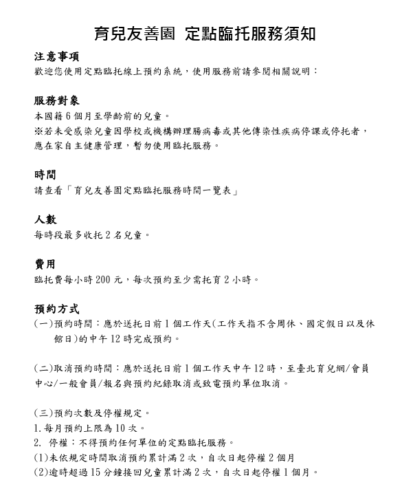 育兒友善園定點臨托服務須知